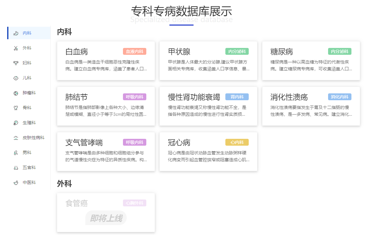 - 专病库通常包含广泛的疾病相关数据,如病人的生物信息、基因型、生活方式、药物使用、实验室检查结果等。这些数据有助于研究疾病的发病机制和风险因素。