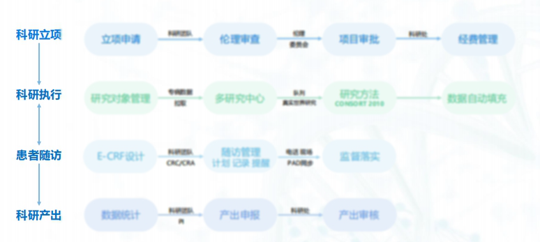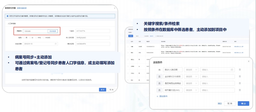 聚粤医疗专病专科数据库包含专病数据、患者360视图、随访、数据筛查、数据质控、自动纳排,数据导出,数据统计分析,科研管理等板块,服务临床科研全过程。