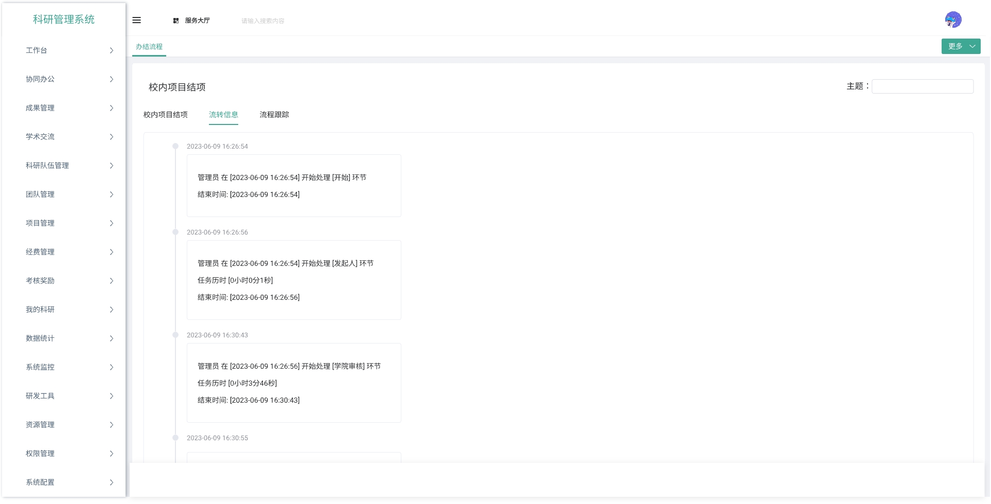 科研项目管理:包括项目申报、立项审批、项目进度跟踪、中期检查、结题验收等功能,实现科研项目的规范化管理。
