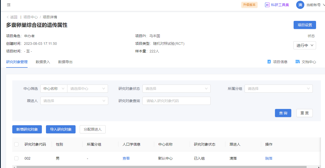 4、自动入组。根据设置条件,患者录入后自动入组,中途不符合条件的患者可手动脱落。