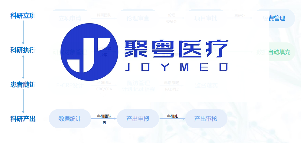 聚粤医疗专病数据库包含专病数据、患者360视图、随访、数据筛查、数据搜索、数据质控、自动纳排,数据导出,数据统计分析,科研管理等板块,服务临床科研全过程。